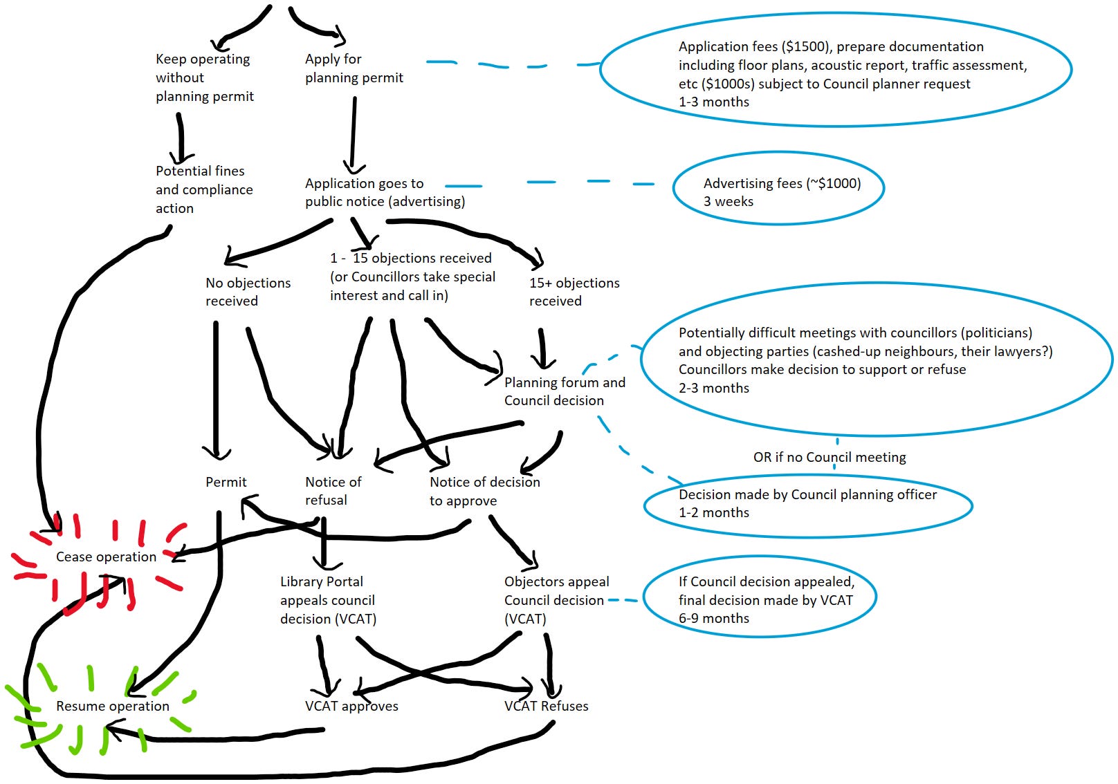 The best case scenario would be a permit granted within around four months and expenses of $3000 at the very minimum, with restrictive conditions that wouldn’t allow music events. The worst case scenario would be a process that lasts more than a year, would cost exponentially more than the previous figure, and would be extremely emotionally taxing on the volunteers involved, still potentially resulting in a refusal - which would mean no permit being granted at the end of proceedings. And that’s with pro bono offers, including me writing submissions / handling meetings / etc and someone like Tess, an architect, preparing floor plans (I didn’t ask but I’m sure she would).
